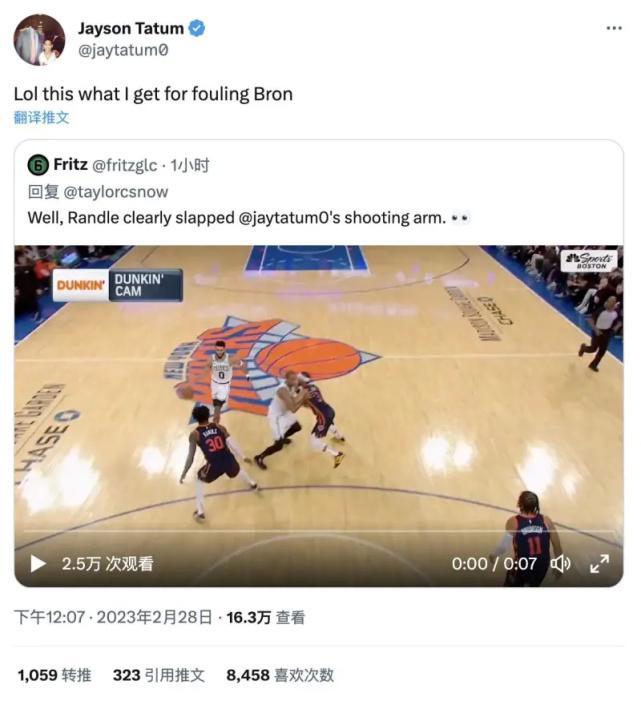 注:此前湖人对阵绿军时,塔图姆在最后关键时刻对詹姆斯犯规,并且逃过了裁判的判罚,而湖人也因此输球。赛后当有记者询问其是否犯规时,塔图姆表示自己忘记了。